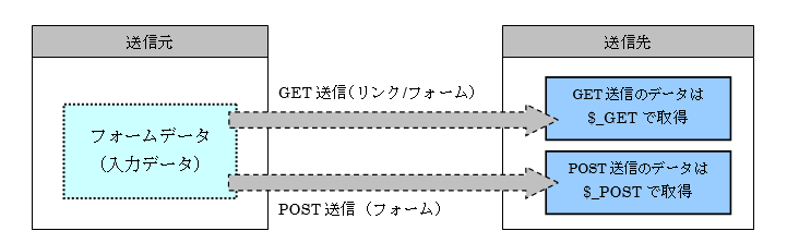 PHPでフォームデータを扱うには、HTML側のデータ送信方式を知っておく必要があります。データの送信方法式は以下に示す2つなので、覚える事がそんなに難しくありません。但しGET送信には複数の指定方法がありますので、この3つの指定方法を覚えておく必要があります。