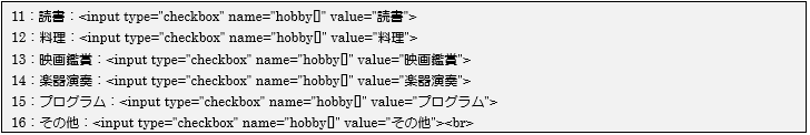 11~16行目では同じチェックボックスの部品名に「hobby[]」を付けています。