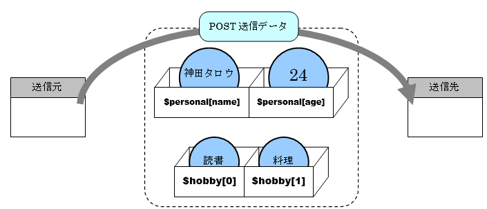 送信元の部品名に「部品名[]」と付けていますが、送信先でスーパーグローバル変数で受け取る場合には「[‘部品名’]」として「[ ]」は付けないことに注意してください。