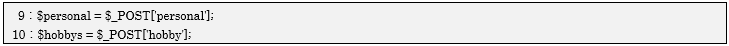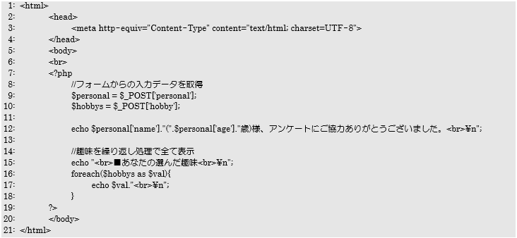 12行目ではテキストボックスの入力データである、名前と年齢を画面に表示しています。テキストボックスの部品名にpersonal[name]とpersonal[age]と指定されていた場合、PHPで受け取ったデータも同じ名前「name」と「age」で連想配列として格納されています。値をPHP側で参照したい場合、部品名[XXX]のXXX部分に合わせて文字列キーを指定する必要があります。
