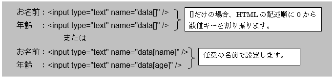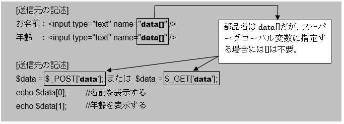 HTMLの部品名に同じ名前を付けその後ろに「[ ]」を付けると、複数の部品の入力データを配列としてまとめて送ることが可能になります。この記述方法はPHPで学習した配列の仕組みと同じです。配列と同じ仕組みのため、[]だけで指定すると数値キーを割り振ってデータを送り、[]の中に文字キーを付けると連想配列データとして送ることができます。
