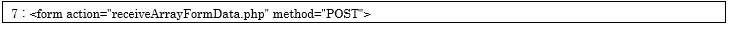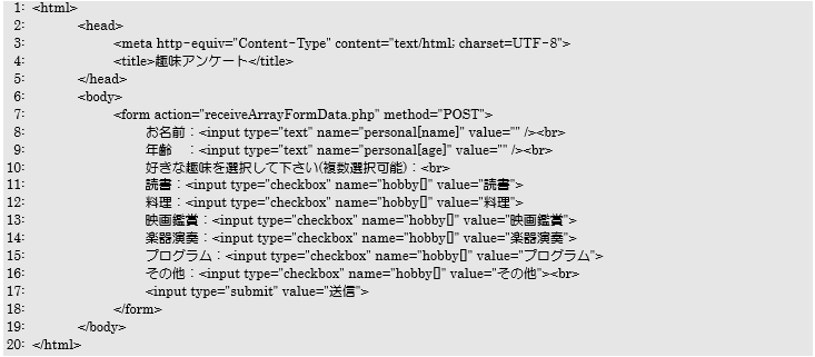 7行目のformタグで送信先にreceiveArrayFormData.phpと送信方法にPOSTを指定しています。