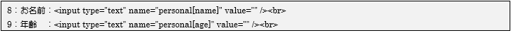8、9行目で2つのテキストボックスの部品名に同じ名前「personal」を付けています。但しキー値として8行目のお名前のデータには「[name]」、9行目の年齢のデータには「[age]」を設定し、連想配列となるようにしています。