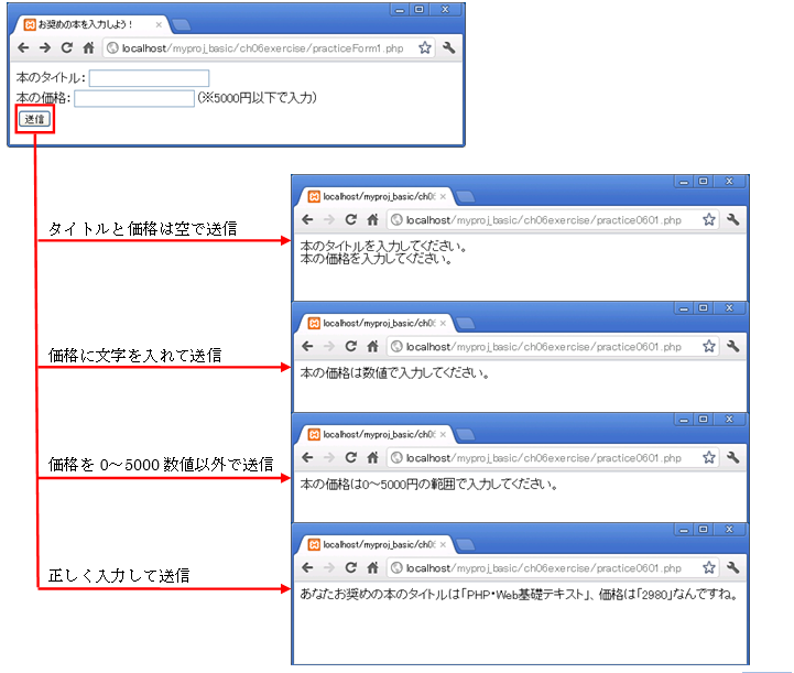 問2 以下の実行結果になるように仕様に従い、入力値チェックを行うpractice0601.phpを作成しなさい。
