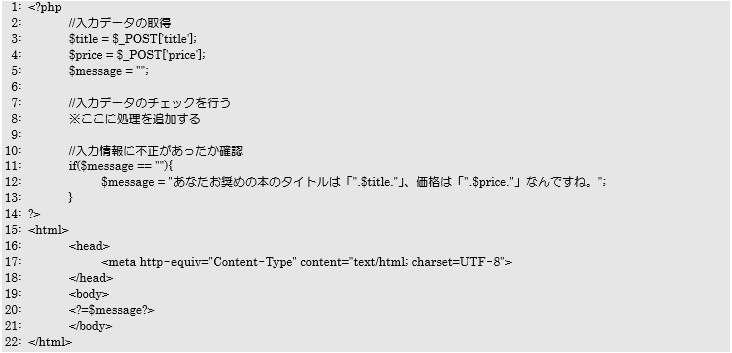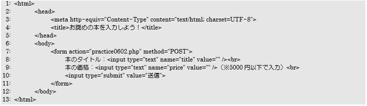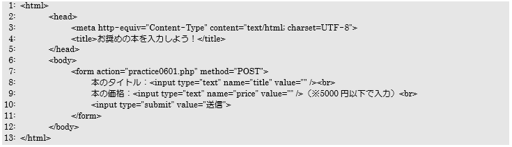 問3 問2で作成したpractice0601.phpに出力データの無害化を行ったpractice0602.phpを作成しなさい。