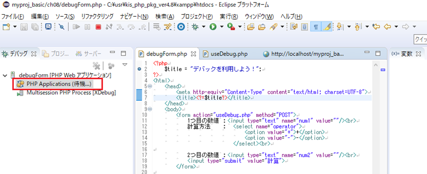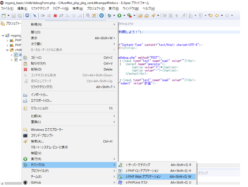 「debugForm.php」を右クリック > デバッグ(D) > PHP Webアプリケーションを選択します。