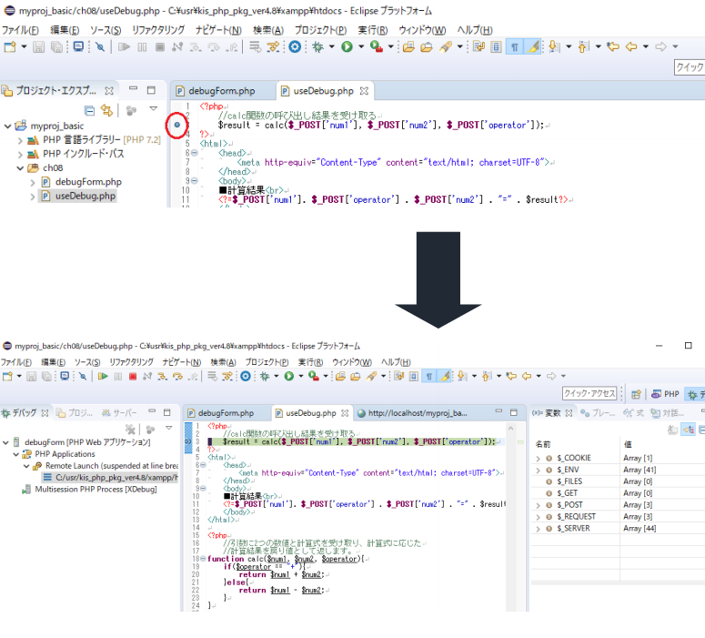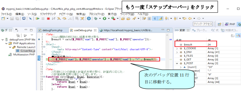 タブ)のフォームからデータを入力して送信(計算ボタン)を行えば、遷移先である useDebug.php の先頭行からデバッグ処理が引き続き行われるようになっているのです。