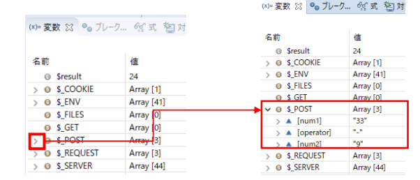debugForm.phpはPOST送信のため、変数ビューでは$_POSTの左側の「+」マークをクリックします。展開された内容から、POST送信データの一覧を確認することができます。