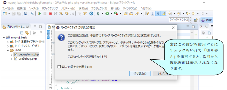 図 8.3.2:PHPデバッグパースペクティブ画面へ切り替え