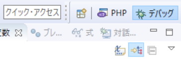 デバッグ実行を行うと、自動で「デバッグ」パースペクティブ画面に切り替わりましたが、初めの画面に戻したい場合は右端の「PHP」パースペクティブをクリックして戻す必要があります。