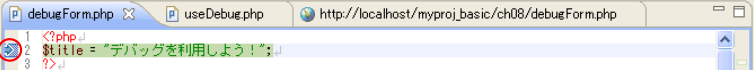 「debugForm.php」にブレークポイントの設定を行います。今回は、最初の処理から確認していくため、2行目にブレークポイントを設定してください。