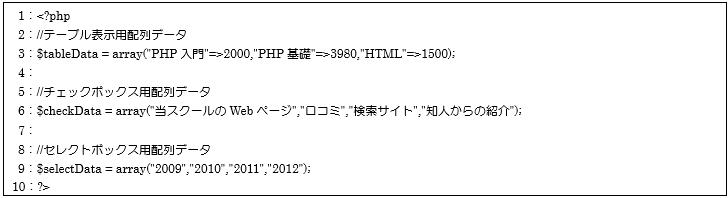 1~10行目の間でarray関数を利用して、各配列変数に表示用データを設定しています。
