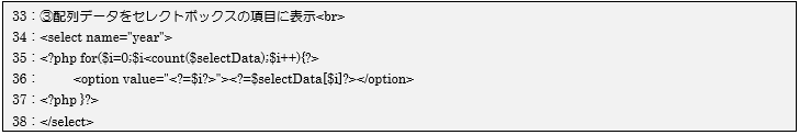 35行目ではfor文とcount関数を組み合わせて、配列変数$selectDataの数分だけ<option>タグを表示しています。その際にはvalue属性にはカウント変数$i、表示項目として配列の格納データを設定しています。