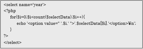 上記のように<option>タグのHTML文章を、echo文を利用して文字列として出力すればPHPモードを区切らずに処理を記述できます。しかし、「”」の文字列囲み、文字連結などでHTML文章が分かり難くなってしまうため、本節で学習したようにPHPモードを区切って記述する方法をお薦めします。