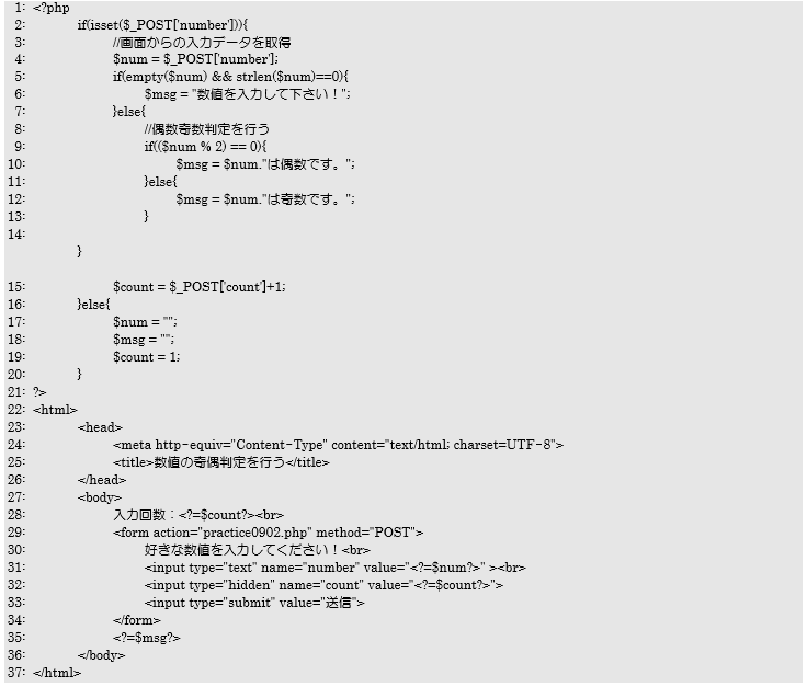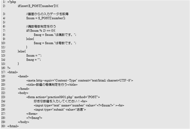 プログラムの先頭で条件分岐文とisset関数を使って入力情報の有無を確認します。確認した結果、入力情報が無い場合は初回アクセスと判断でき、elseブロックで使用する変数を空文字で設定します。逆に入力情報があれば送信ボタンからのアクセスと判断でき、ifブロック内でPOSTデータを取得し奇偶判定を行い変数に結果を設定します。