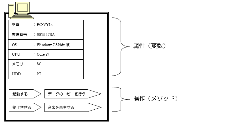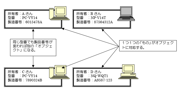 例えば、パソコンは1つの「もの」ですが、オブジェクト指向の考え方で表すと、「Aさんが持っている型番PC-VY14で、製造番号が6015478Aのパソコン」が1つのオブジェクトに対応します。同じ型番のパソコンは世の中にたくさん存在していますが、ある製造番号のパソコンは1つしか存在していません。