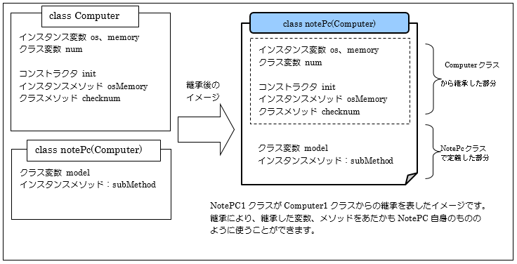 クラスを継承する方法はそれほど難しくありません。凡例を見ても分かるように新しいクラス名の引数に「継承元のクラス名」を指定すれば、これだけでNotePcクラスはComputeクラスの機能全てを受け継ぐこと(継承)ができます。後はComputerクラスにはない、NotePcクラスに必要な変数やメソッドを記述すればよいのです。