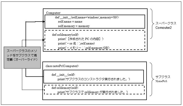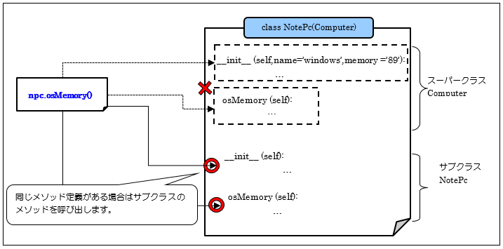 12行目でComputerクラスを継承したNotePcクラスを定義しており、クラス内でコンストラクタ用のメソッド、osMemory()メソッドを独自に定義してます。