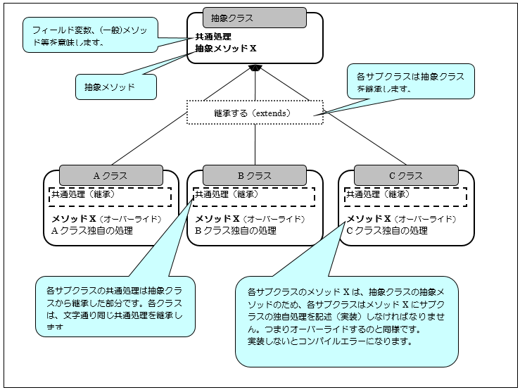 - 抽象メソッドがある抽象クラスを継承したサブクラスは、抽象メソッドを必ずオーバーライドしなければなりません。(オーバーライドしないとコンパイラエラーになります。)