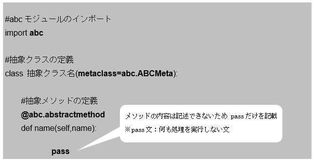 - 抽象クラスを定義するには引数に「metaclass=abc.ABCMeta」を指定する。さらに抽象メソッドにはpassだけを記述する。