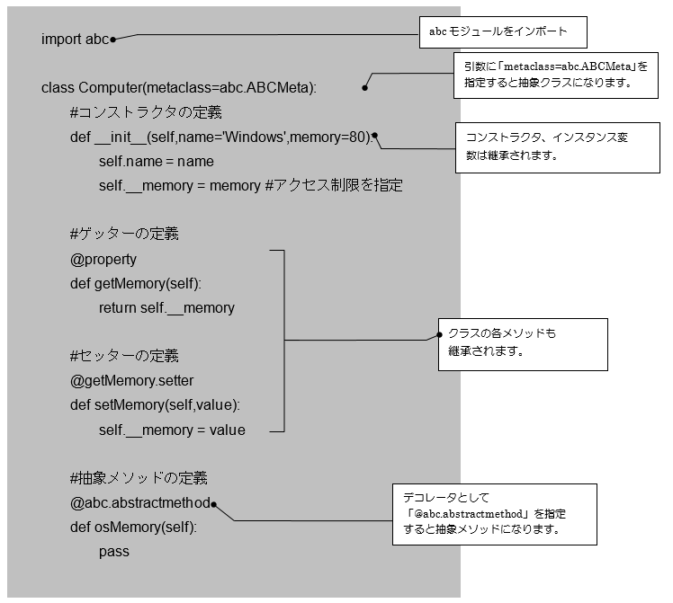 抽象クラスの定義は、引数に「metaclass=abc.ABCMeta」を指定する以外、通常のクラスを定義する方法と同じです。