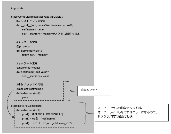 上記凡例で示したnotePcクラスは、Computerクラスを継承しています。Computerクラスには抽象メソッド「osMemory()」が定義されているので、サブクラスであるnotePc内でosMemory ()メソッドをオーバーライドしています。この抽象メソッドのオーバーライドを行わないとコンパイルエラーになるので注意が必要です。