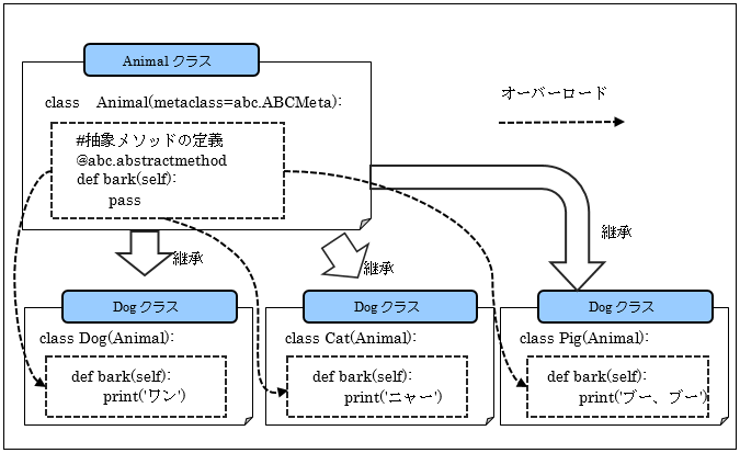 また抽象クラス内で、デコレータとして「@abc.abstractmethod」を指定されたメソッドは、抽象メソッドになります。