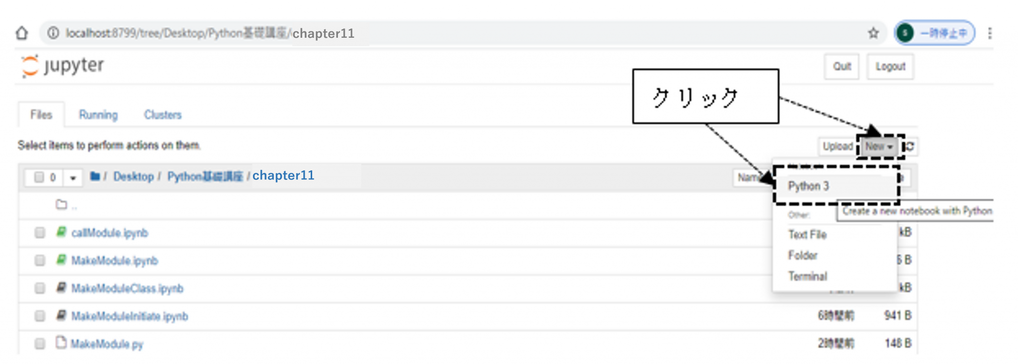 「Python基礎講座 > chapter11//」を開いたら、左上の「New」→「Python3」の手順にボタンをクリックして新規の「Untitled.ipynb」を作成します。
