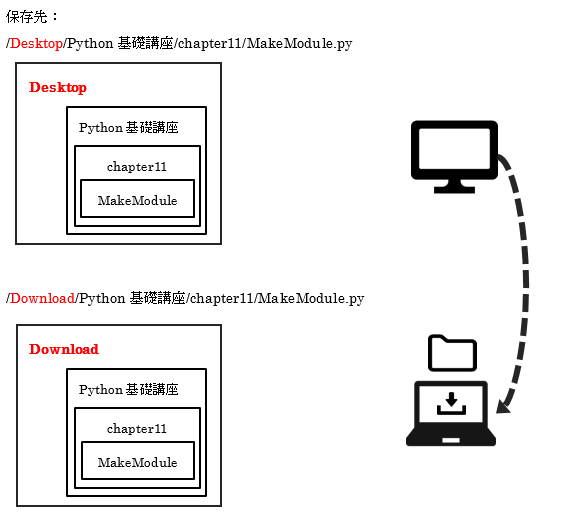 凡例:「Python基礎講座/otherdirectory/」から「Python基礎講座/chapter11/MakeModule.py」の呼び出す