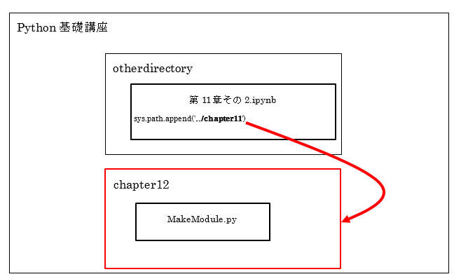 「otherdirectory」フォルダにとって「Python基礎講座」は一つ上の階層ですので、「sys.path.append(‘. ./chapter11’)」によって「Python基礎講座/chapter11」を指定したことになります。