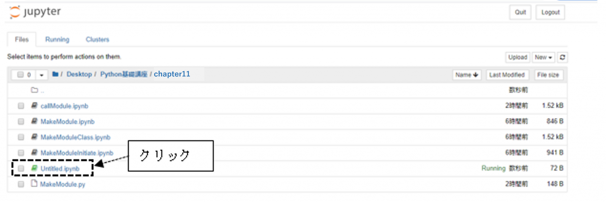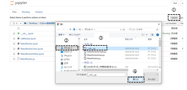 JupyterNotebookで「/Desktop/Python基礎講座/chapter11/」フォルダを開いたら、右上の「Upload」ボタンをクリックし、ダウンロードフォルダから「__init__.py」を選択してください。
