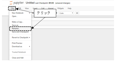 「Untitled.ipynb」のファイルを開いたら、左上の「File」→「Rename」の順番にクリックします。