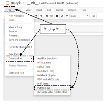 ファイルの生成は、左上の「File」を選択し、「Download as」の「Python(.py)」を選択してください。
