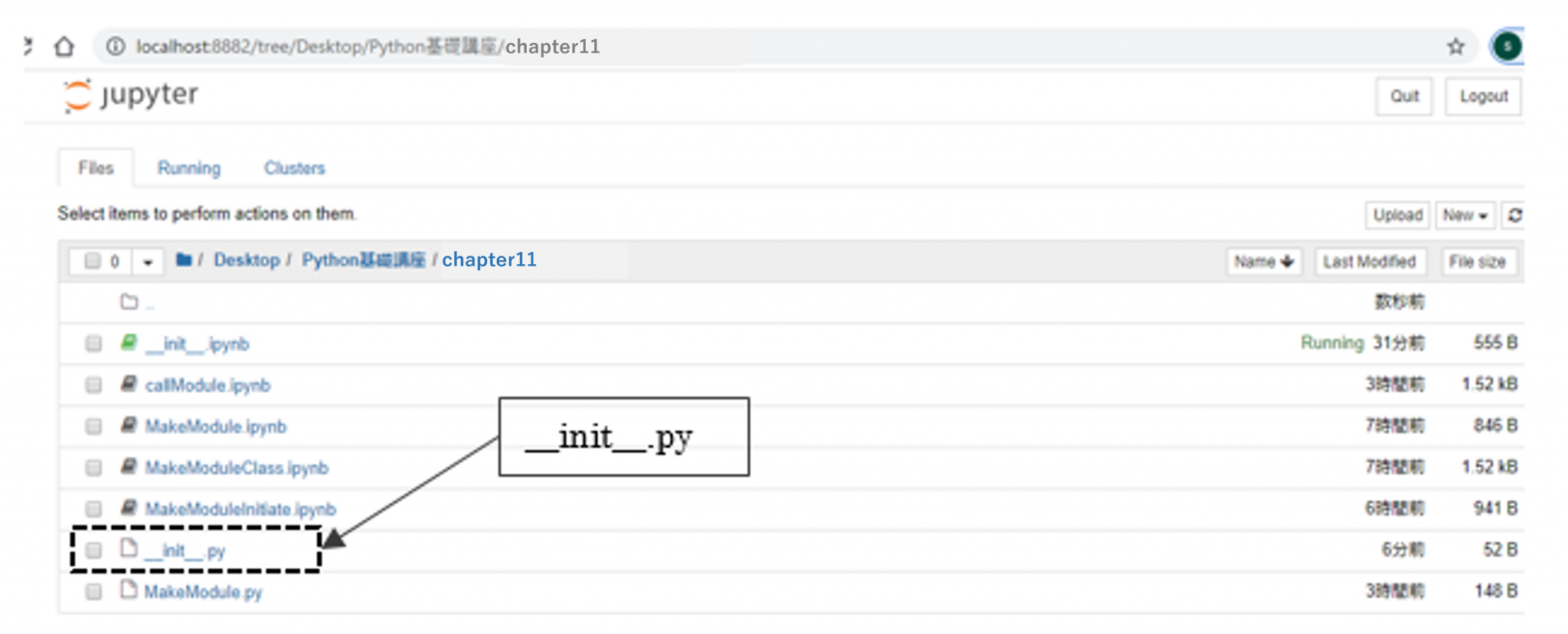 フォルダについては「chapter11//」が既に用意されてますので、当テキストではJupyterNotebookを介して「__init__.py」ファイルの作成方法について解説していきます。
