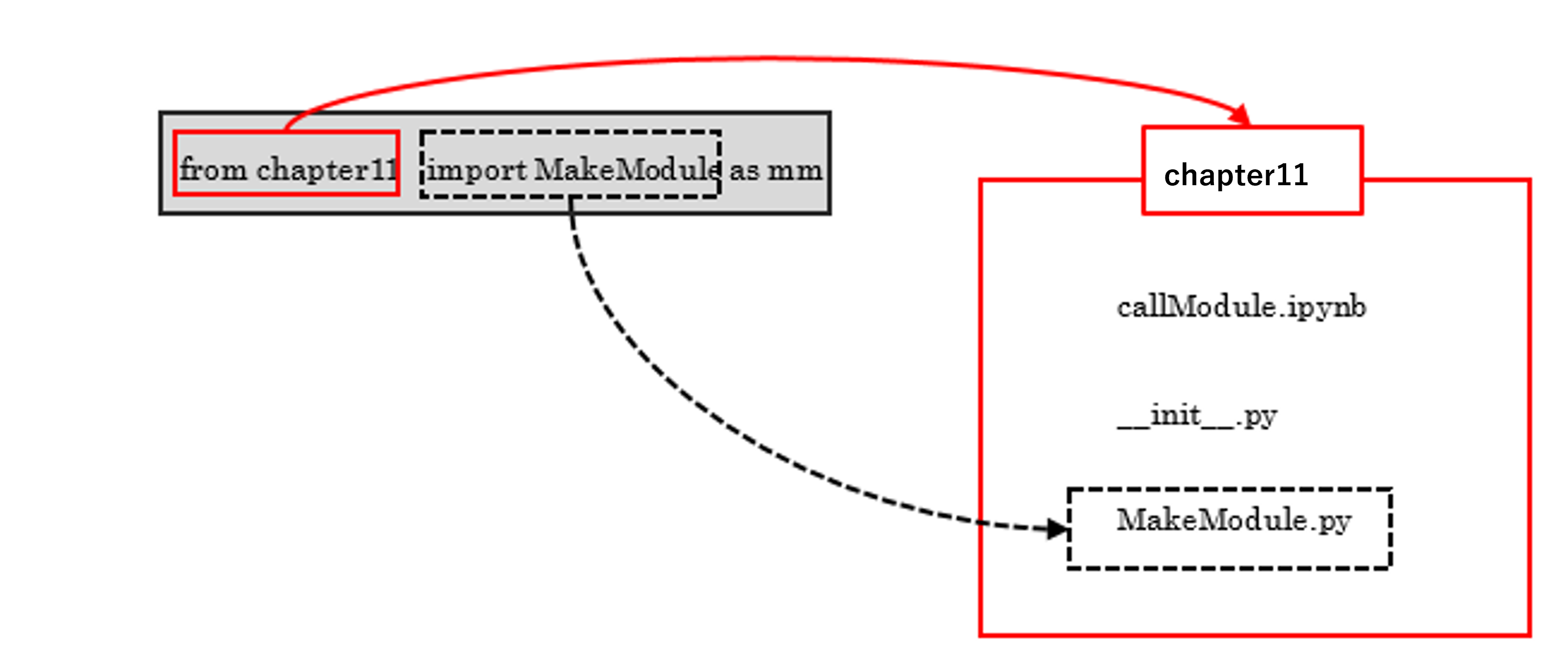 「 from chapter11」となっているので、呼び出し先が「chapter11」パッケージの中にあるモジュールに限定されてます。