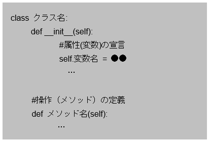 前章でクラスは属性(インスタンス変数)と操作(メソッド)を持つものと学習しました。以下にクラスの定義の書式を紹介します。