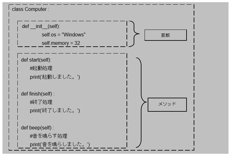 Computerクラスのブロック内には変数の宣言とメソッドの定義を記述しています。では次の節で実際に宣言したクラスを利用する方法について説明していきます。