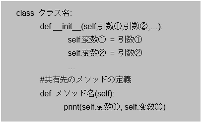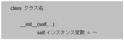 - コンストラクタ内の第一引数に、selfを指定しなくても動作するがselfを指定するのが一般的である。