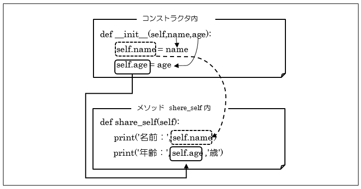 メソッドshare_self内のself.nameには、コンストラクタ内のself.nameの値(nameの値)が参照され、メソッドshare_self内のself.ageコンストラクタ内のself.ageの値(ageの値)が参照されます。