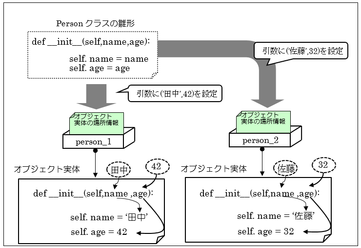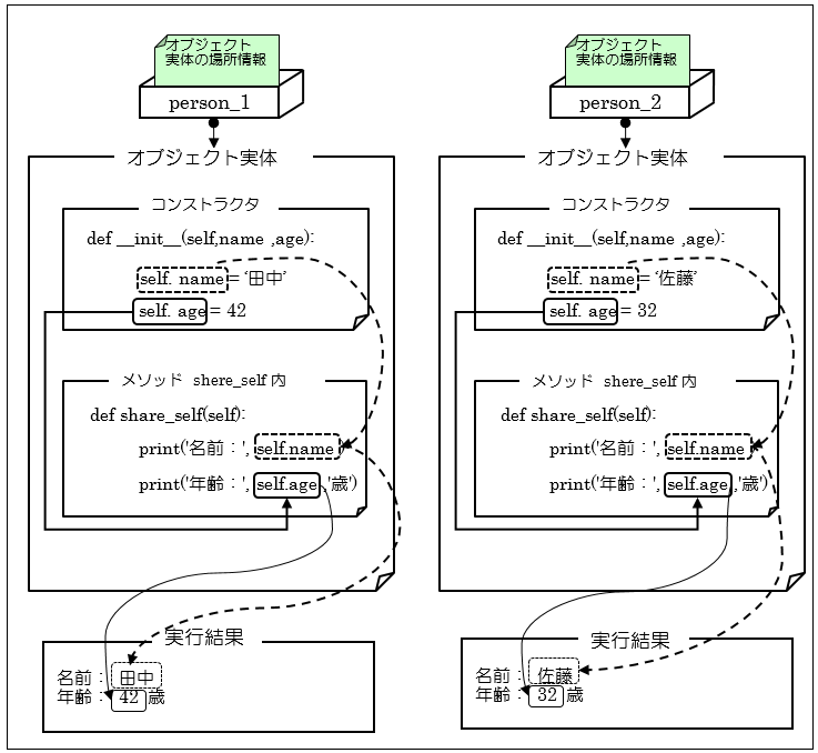 person_1のself.name、self.ageには「田中」、「42」が格納されており、share.self()はコンストラクタのselfを参照するので、share_self内のself.nameには「田中」、self.ageには「42」が格納されるため、先ほどのような実行結果が得られます。