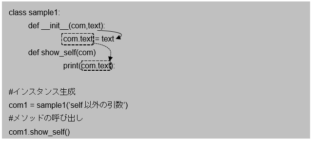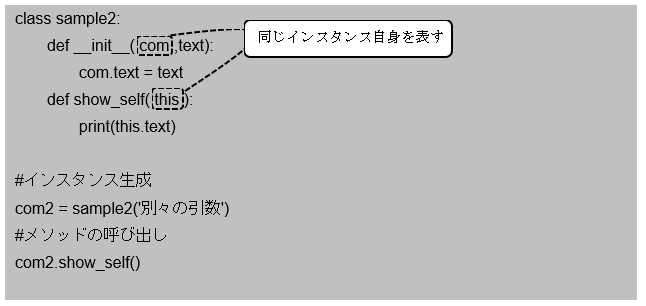 self以外の引数を指定した場合でも上記から同じ動作が行われていることがわかります。コンストラクタの引数textには「self以外の引数」が設定されているので、インスタンス変数text(com.text)には、「self以外の引数」が代入されています。