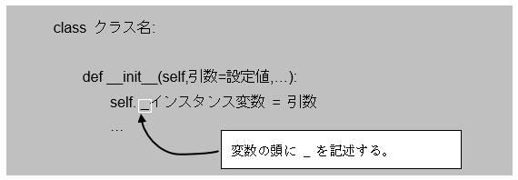 Pythonでは、インスタンス変数のアクセス制限を行う時に、コンストラクタで定義する際に、インスタンス変数の頭文字に_(アンダースコア)を設けることでアクセス制限を示す慣習となってます。