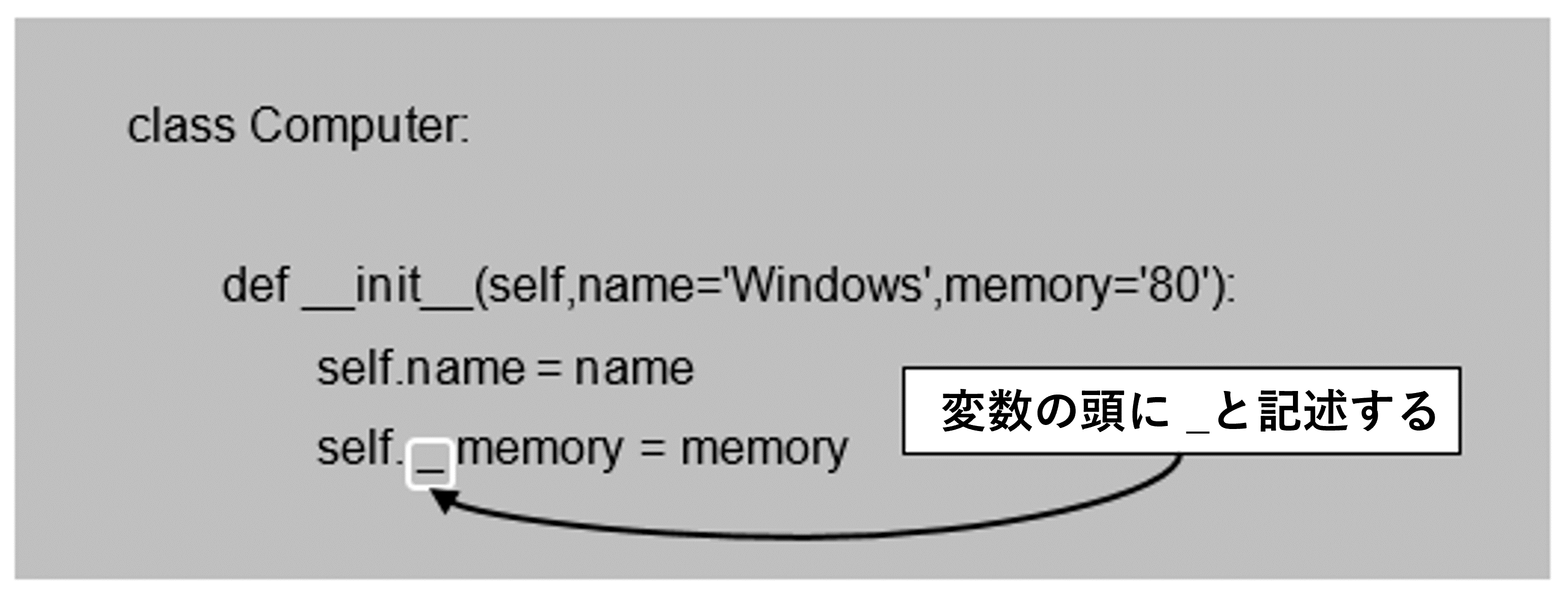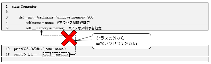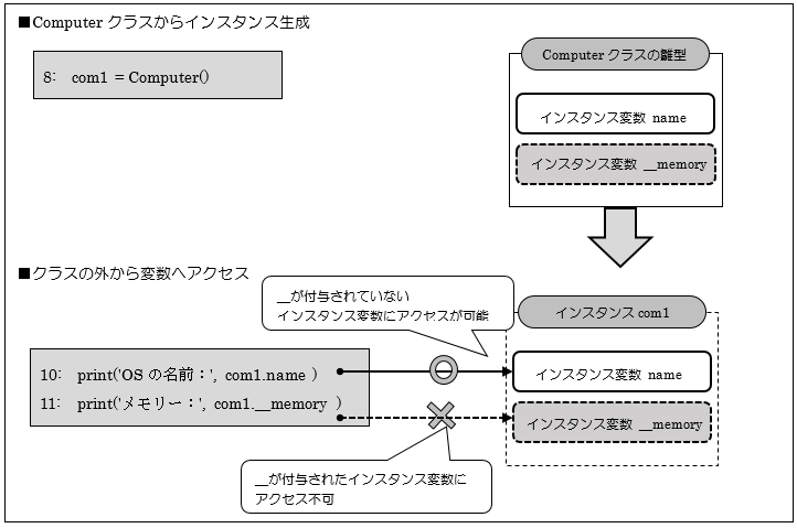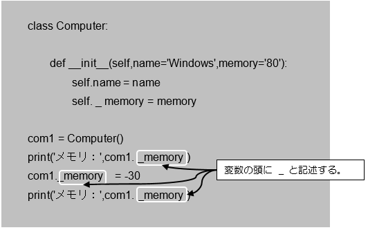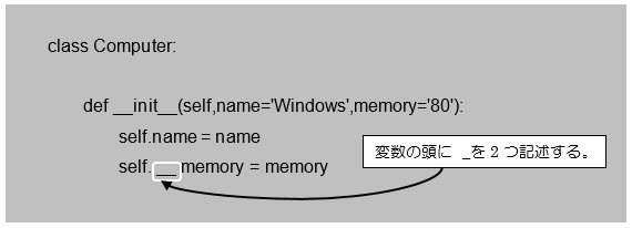 1~5行目でComputerクラスを定義しています。3~5行目でコンストラクタを定義しており、4、5行目ではインスタンス変数「name」と「__memory」が宣言されており、「__memory」に関しては行頭文字に_(アンダースコア)が2つ付与されているため、クラスの外からはアクセスできません。