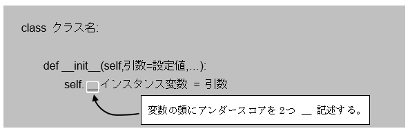 Pythonでインスタンス変数を宣言する際には、このような間違いを起こさせないような仕組みを設ける必要があります。