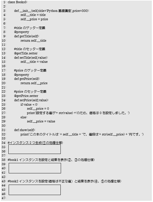 問4 問4でカプセル化したクラスBooksで、不正な値を防ぐ処理を追加したクラスBooks2を作成しなさい。