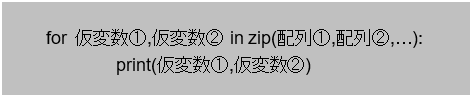 - zip関数は複数の配列を引数に従え、for文を介して各配列の各要素を取り出すことができる。