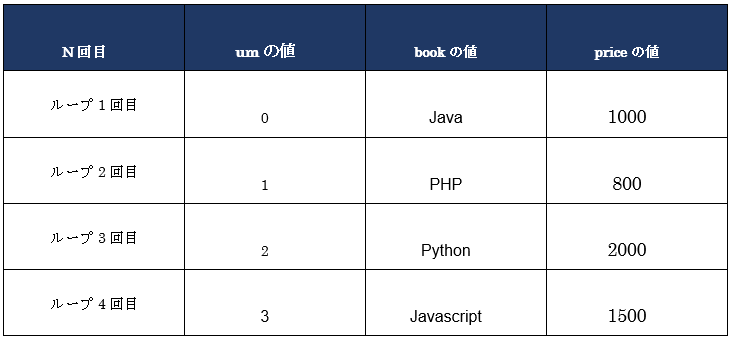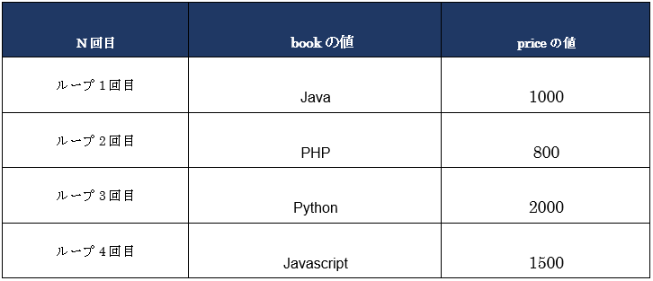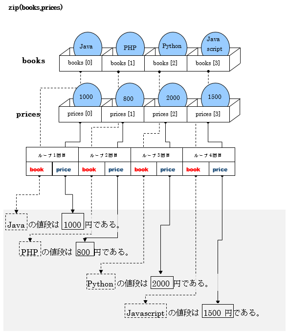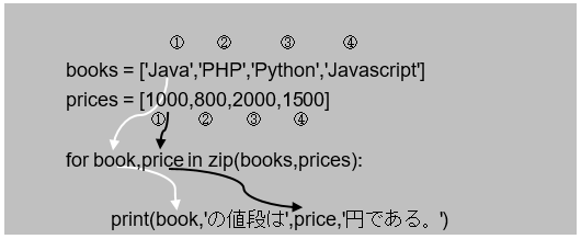 それぞれのリストの各要素は順次取り出され、for文内で宣言した二つの変数(book、price)に代入し、一つの処理が終わると、次の要素の値を代入します。