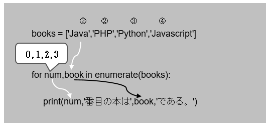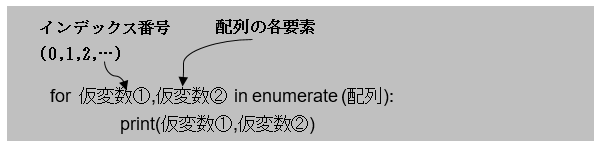 - enumerate関数は配列を引数に従え、for文を介してインデックス番号と各要素の値を取り出すことができる。