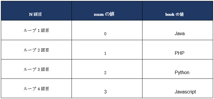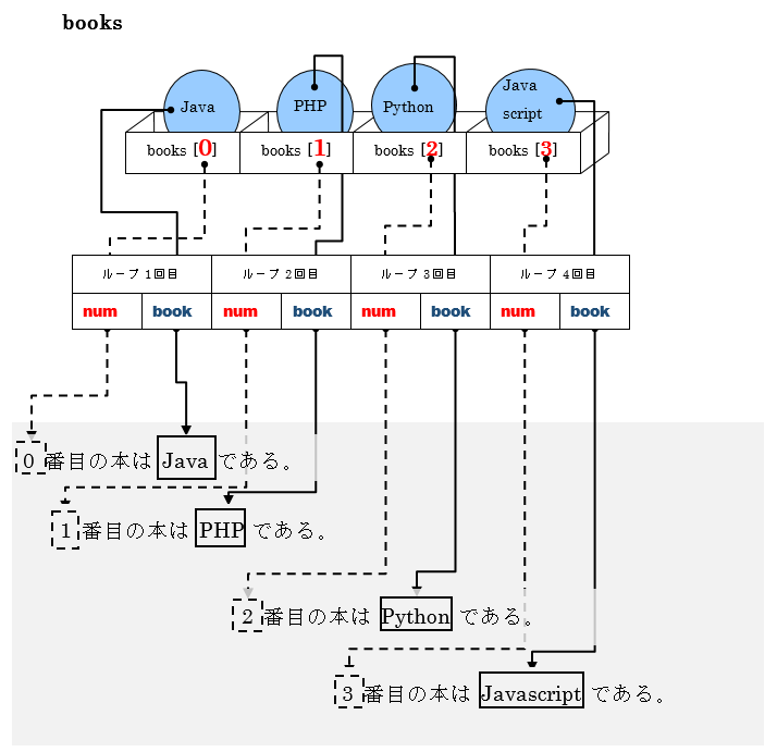 それぞれのリストの各要素は順次取り出され、for文内で宣言した二つの変数(num、book)に代入し、一つの処理が終わると、次の要素の値を代入します。