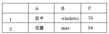 A列に氏名、B列にOS名、C列にメモリー容量といった内容です。